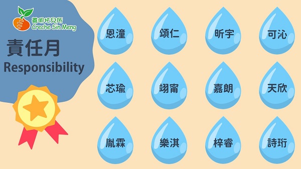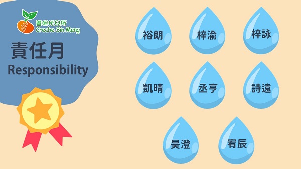 6月份是善明托兒所之幼兒品格星星計劃第六個品格—責任(responsibility)。